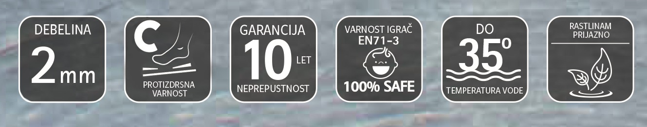 Montaža se izvaja na licu mesta po obliki bazena, protizdrsni razred C zagotavlja visoko stopnjo stabilnosti na stopnicah, stopniščih, otroških bazenih in drugih površinah bazenov. Za varjenje se uporablja vroč zrak.